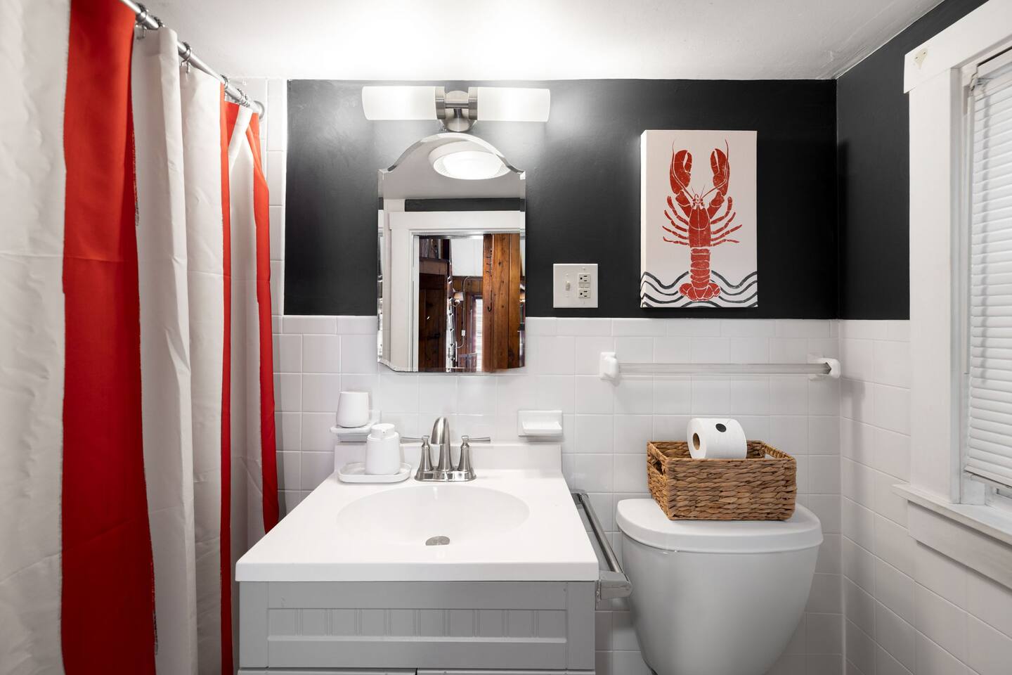 Lobster Pot Getaway: The home offers 1.5 bathrooms for your convenience. The main bathroom is fully stocked with towels, shampoo, conditioner, shower gel, and a hairdryer. A convenient half-bathroom adds extra ease for larger groups.